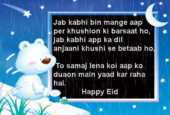 - Aaj Khuda ki hum par ho Meharbani Karde maAf hum logo ki sare NafArmani. Eid Ka din aj aao milkaY kare yahi wada. Khuda ki hi rahoN mai hum chalange sada. Sary Musalman ko EID MUBARAK.